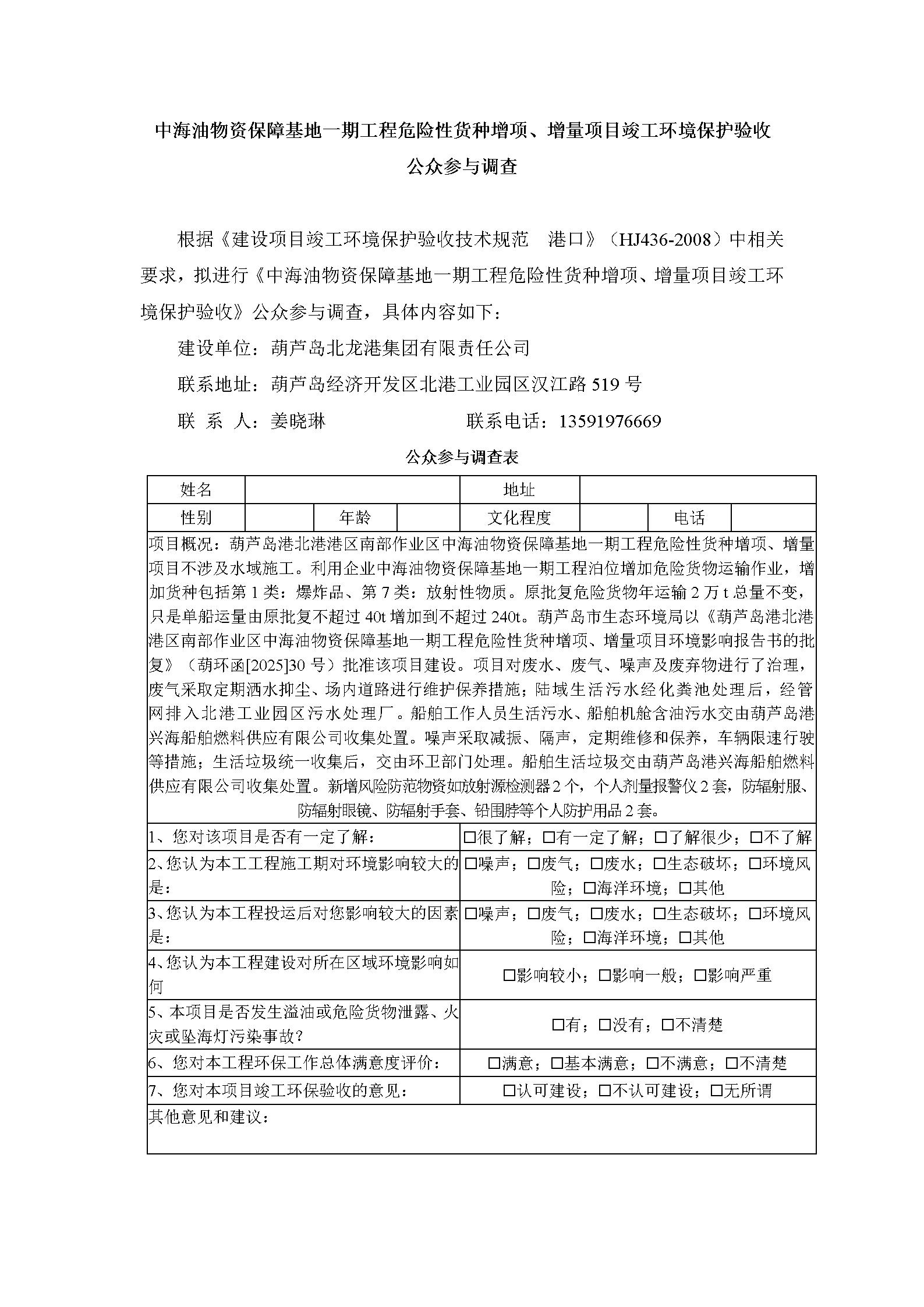 中海油物资保障基地一期工程危险性货种增项、增量项目竣工环境保护验收 公众参与调查