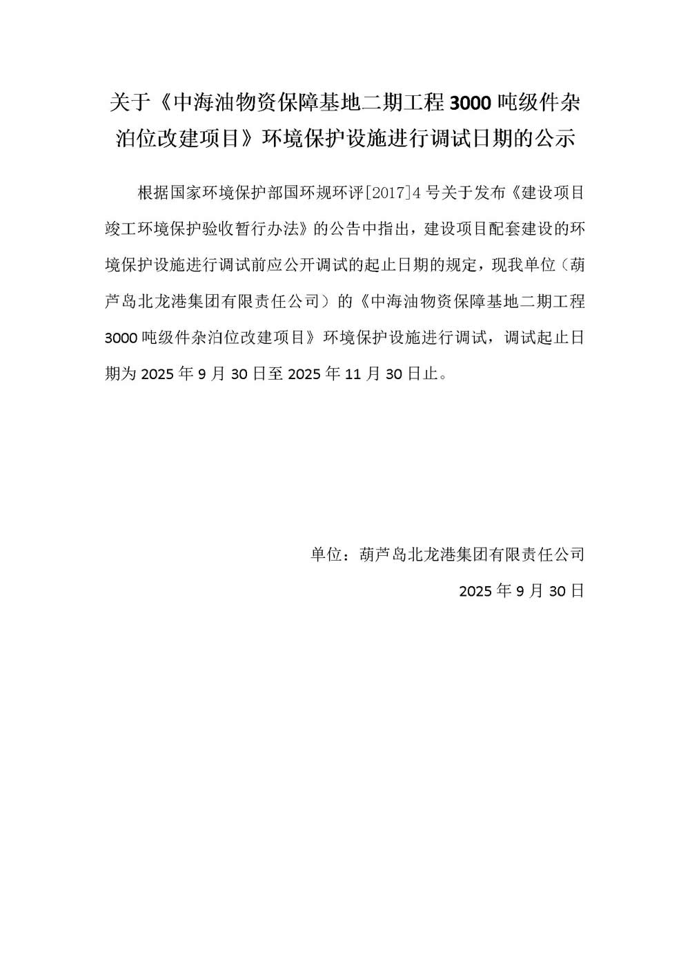 关于《中海油物资保障基地二期工程3000吨级件杂泊位改建项目》环境保护设施进行调试日期的公示